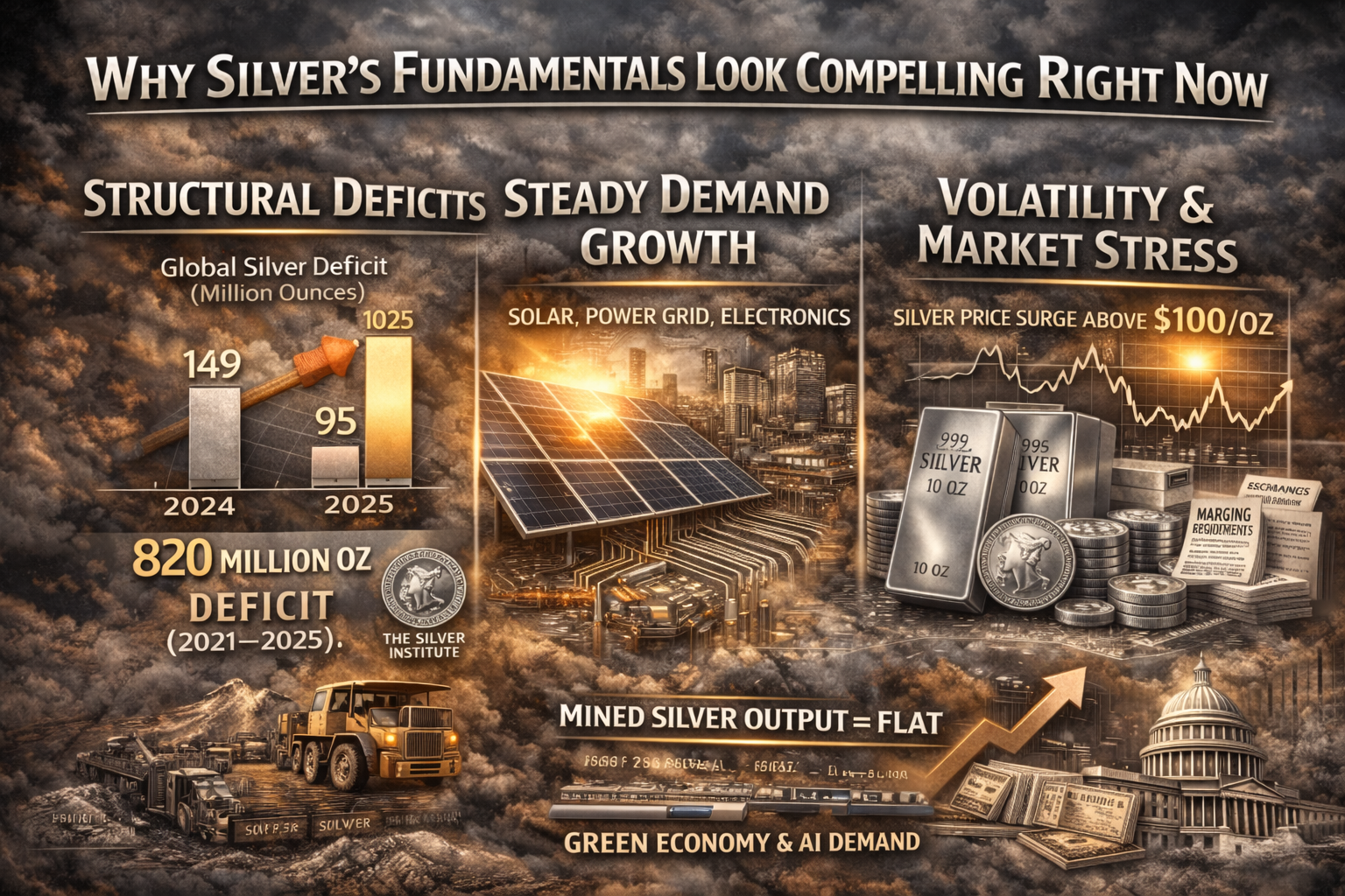 This is not described as a one-off event. A Silver Institute presentation summarizing 2025 expectations described a fifth consecutive year of market deficit, estimating the 2025 shortfall at around 95 million ounces and citing a cumulative deficit of roughly 820 million ounces between 2021 and 2025.