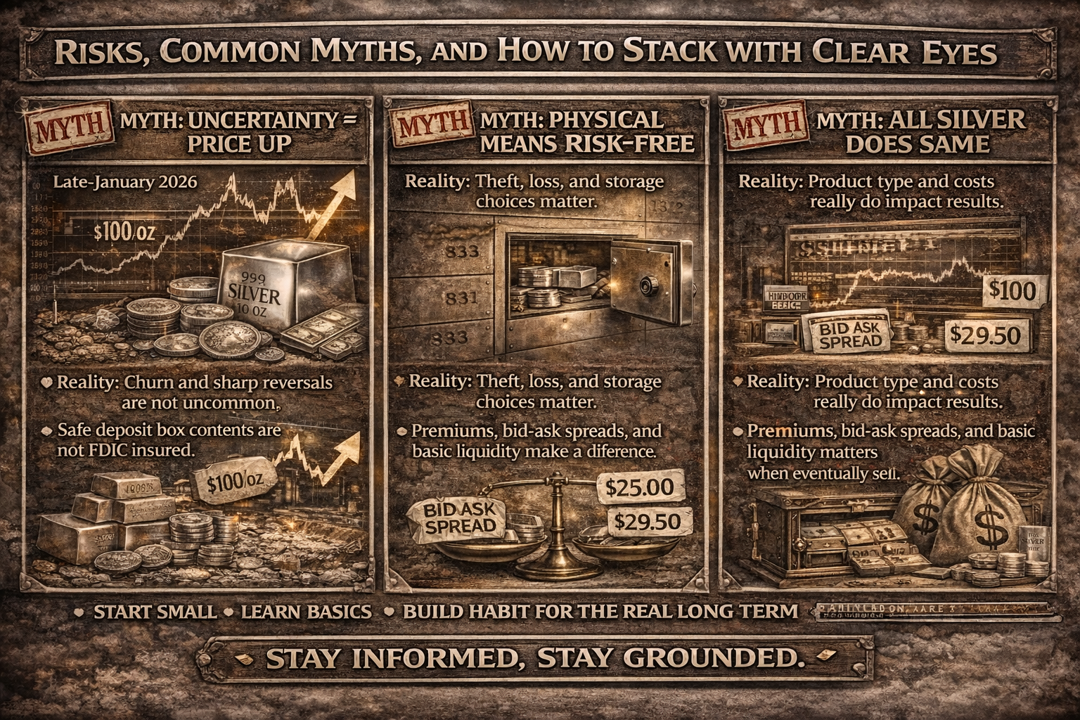 A second misconception: “Physical means risk-free.” Physical silver reduces certain financial-system risks but introduces practical risks: theft, loss, damage, and liquidity frictions. The FDIC’s consumer guidance is blunt that safe deposit box contents are not FDIC-insured, and banks generally do not insure the contents—so storage choices should be intentional, and insurance should be understood, not assumed.