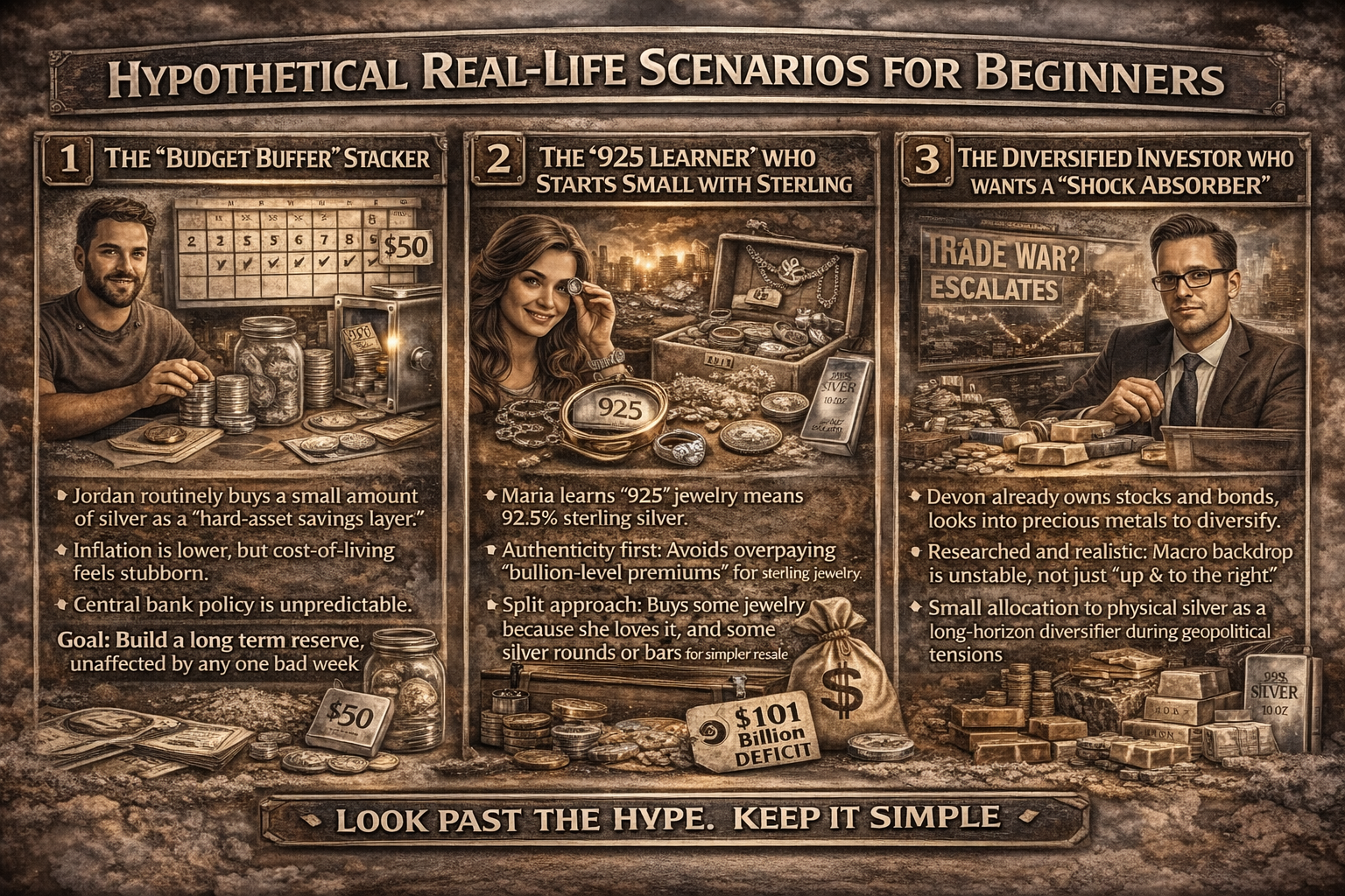 Maria loves jewelry and keeps seeing “925” stamped inside rings and chains. Instead of guessing, Maria learns that 925 indicates 92.5% silver. She also learns the difference between silver jewelry value and bullion value—jewelry can carry craftsmanship premiums that may not be fully recaptured if sold purely for melt. At first, Maria focuses on authenticity (hallmarks) and avoids paying “bullion-level premiums” for pieces priced mostly as fashion.